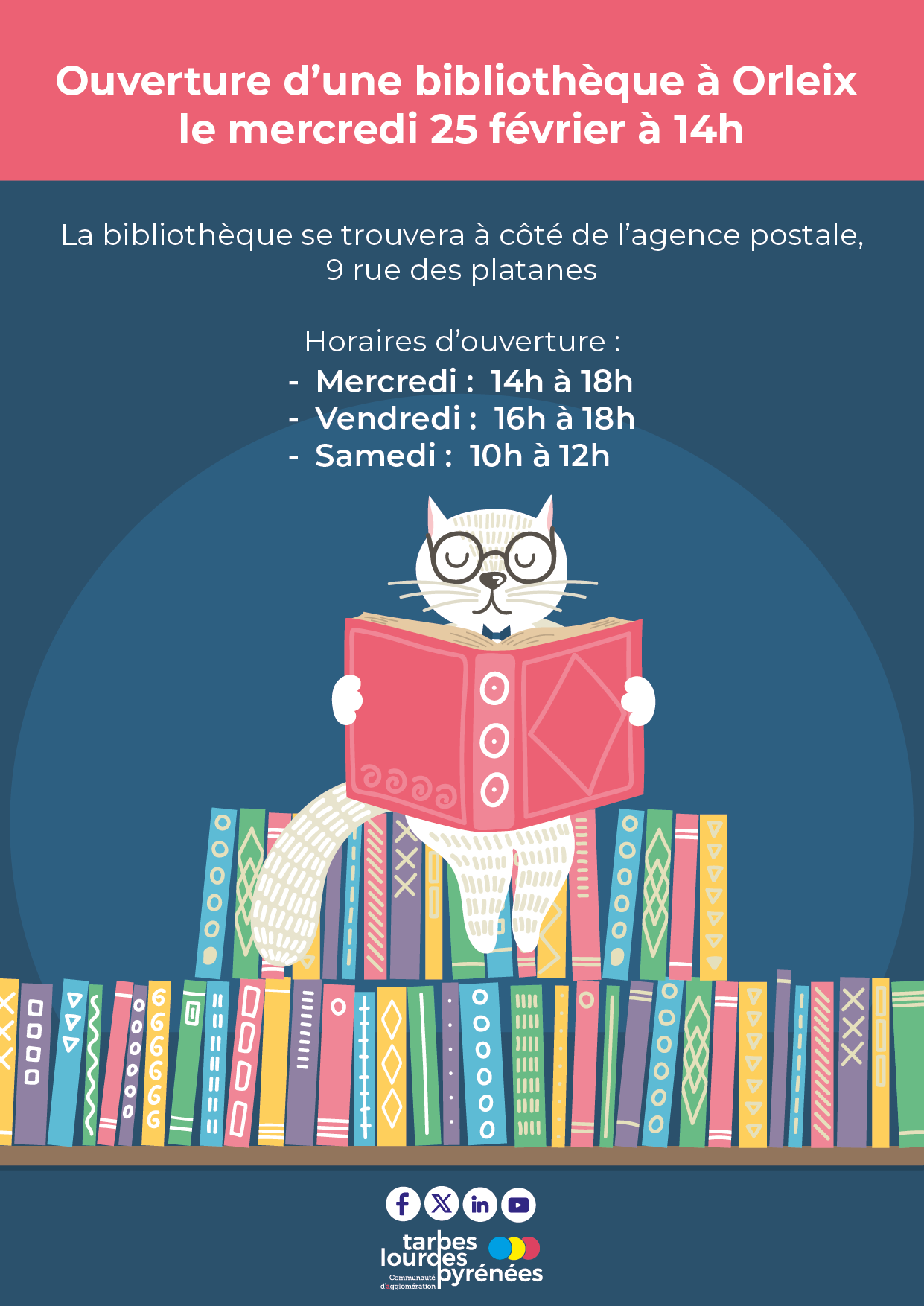 Suite à l’arrêt du bibliobus qui venait à Orleix le vendredi, la commune, désireuse de conserver ce service culturel, notamment pour les écoles, a mis un local à la disposition de la communauté d’agglomération TLP qui ouvre une nouvelle bibliothèque sur la commune d’Orleix, à côté de l’agence postale – 9 rue des Platanes. Cet établissement est le 8ème à rejoindre le réseau des bibliothèques de proximité comme Aureilhan, Bordères sur l’Echez, Séméac, Barbazan Debat, Odos, Soues et Ibos.