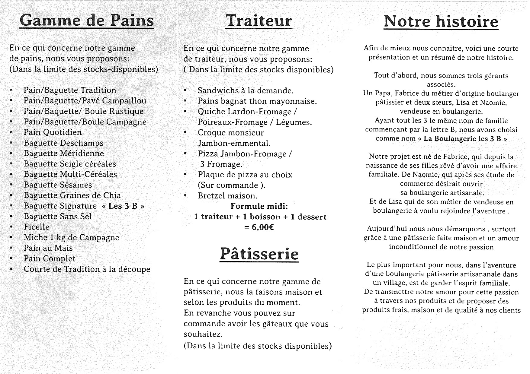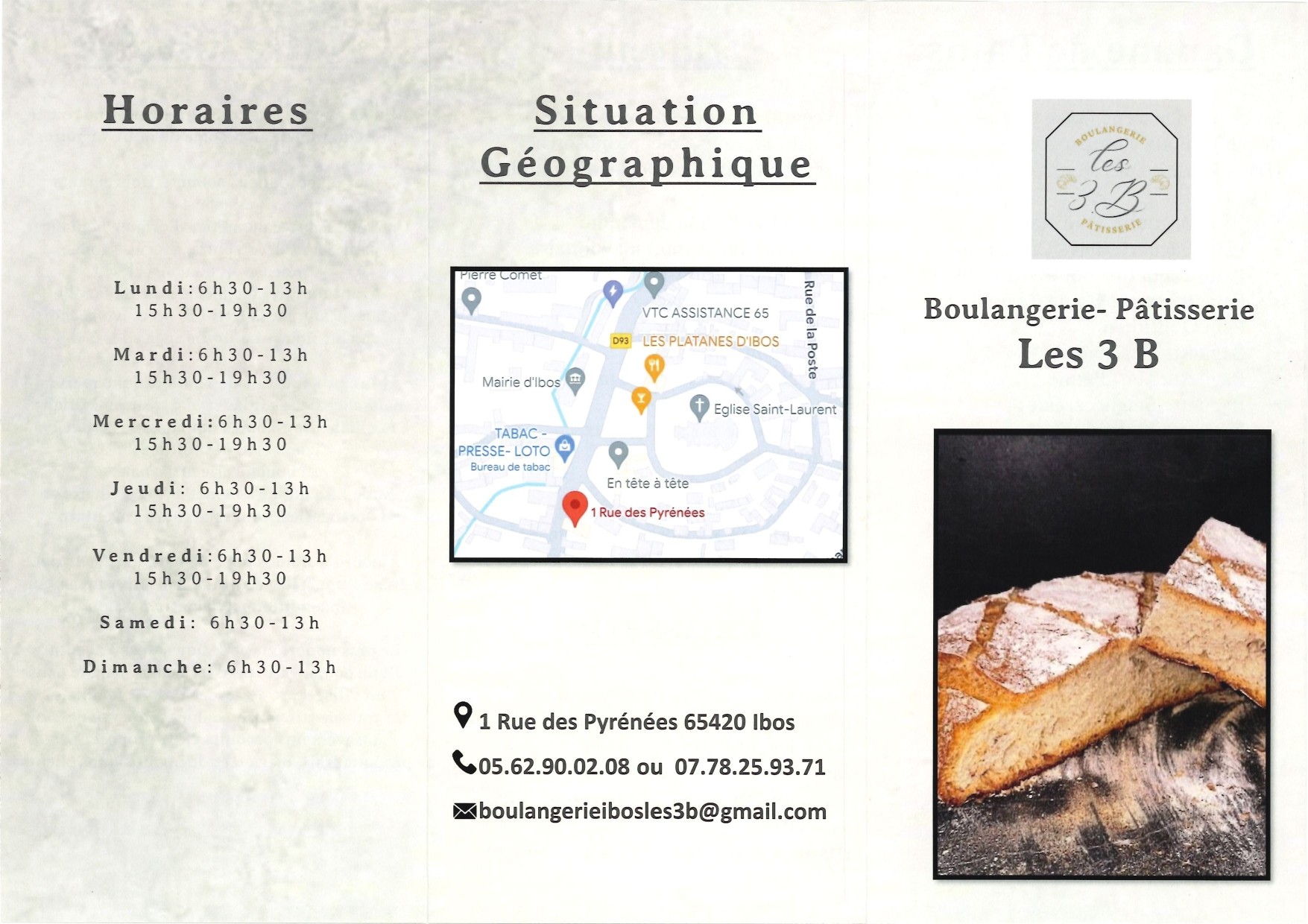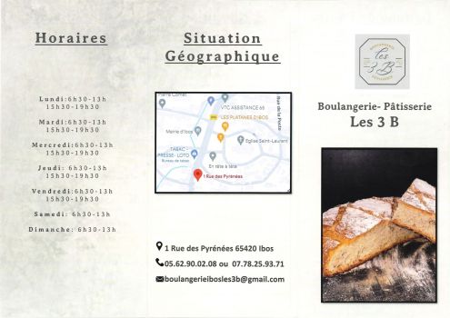 « La boulangerie les 3 B », déjà présente à Ibos et Odos, va proposer sa gamme de pains, voire plus, aux habitants de notre commune tous les mardi et vendredi de 10h00 à 12h30 sur le parking de la salle des fêtes à compter du 10 mars prochain. Le plus important pour eux : « transmettre notre amour et notre passion, proposer des produits frais, maison et de qualité à nos clients » Ils vous attendent nombreux devant leur camion pour profiter de leur savoir faire.